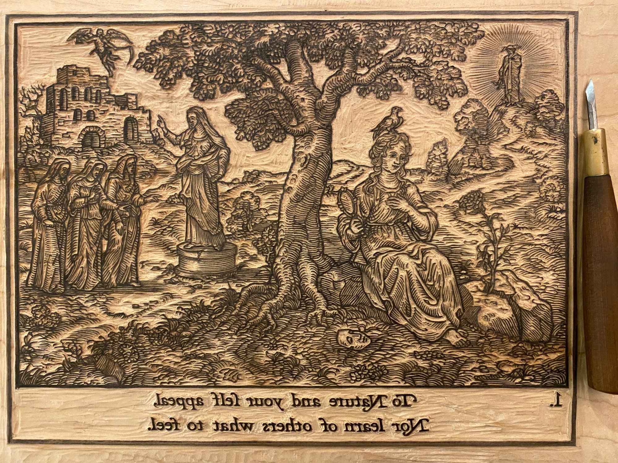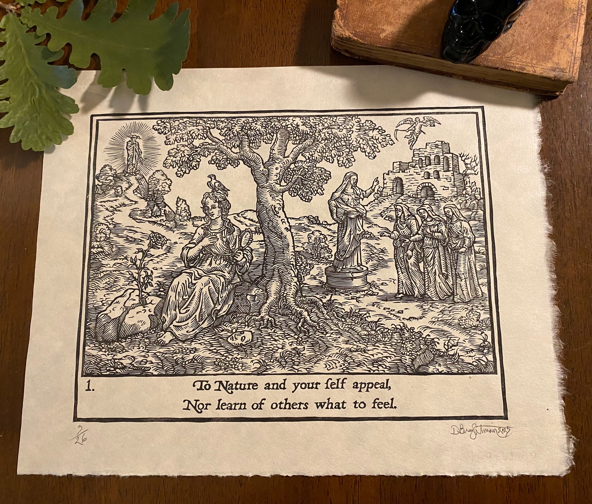 Handmade woodcut print of original artwork on fine kitakata printmaking paper, done with oil-based etching ink.