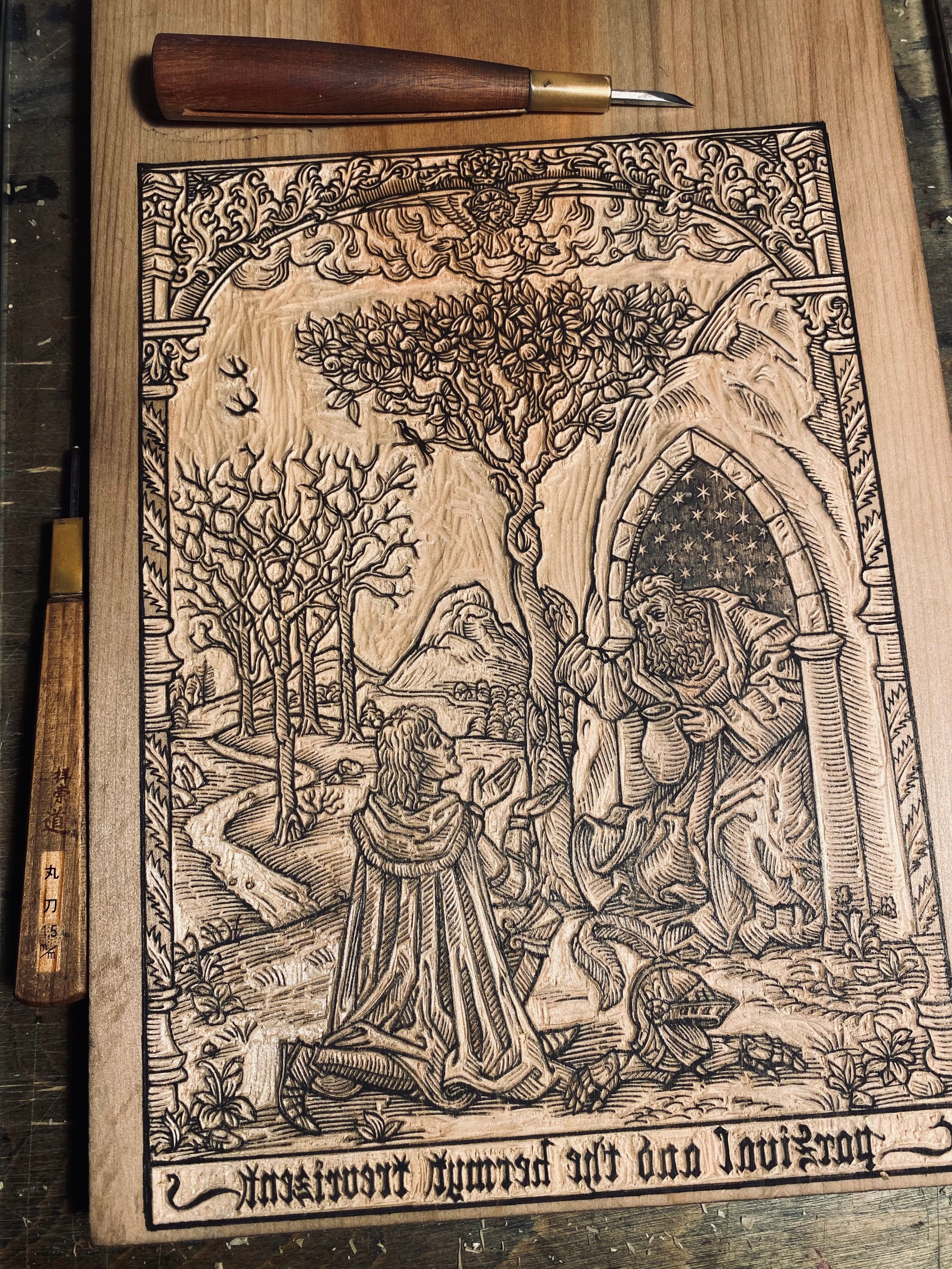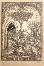 Handmade woodcut print of original artwork on fine kitakata printmaking paper, done with oil-based etching ink.