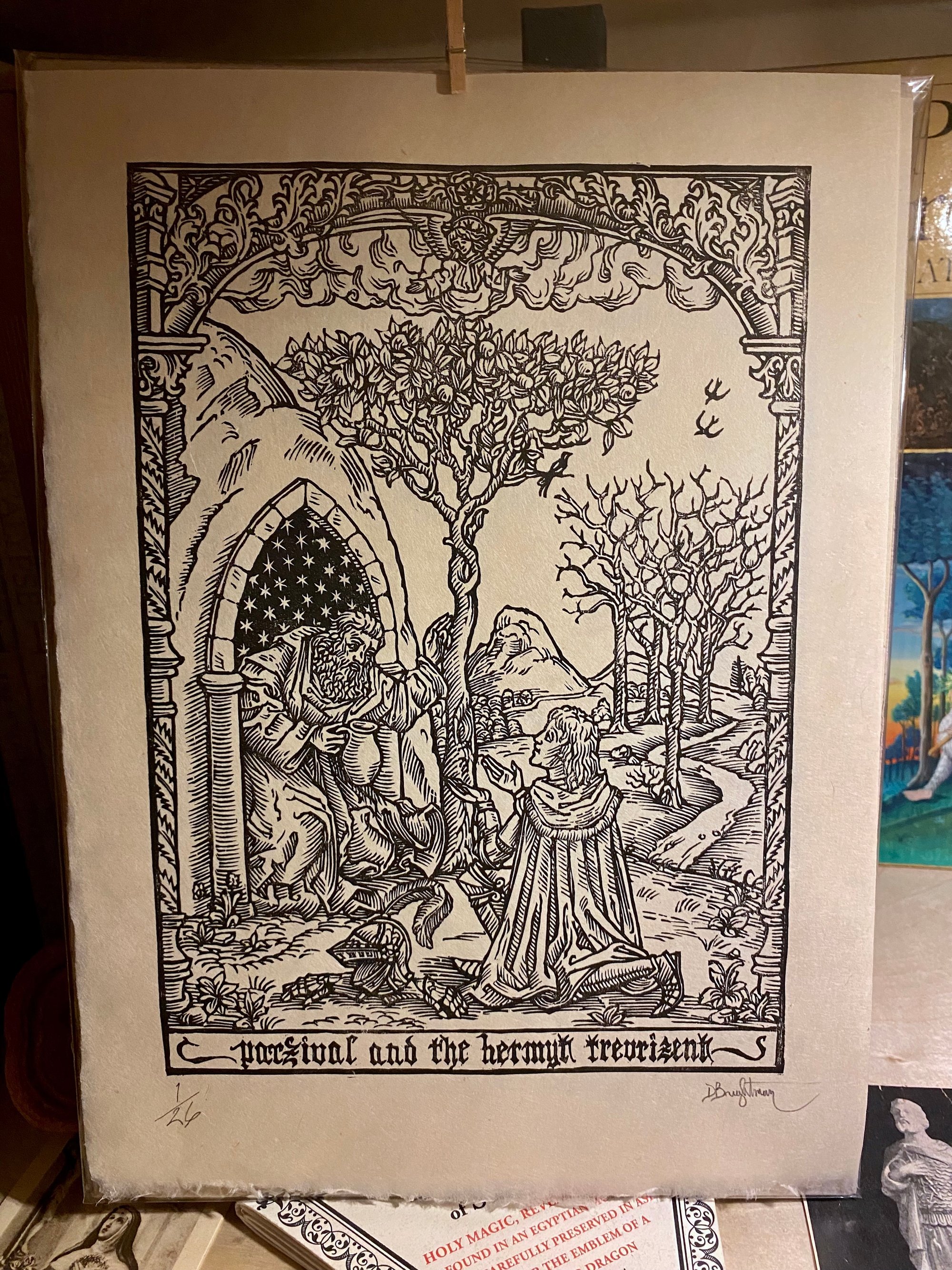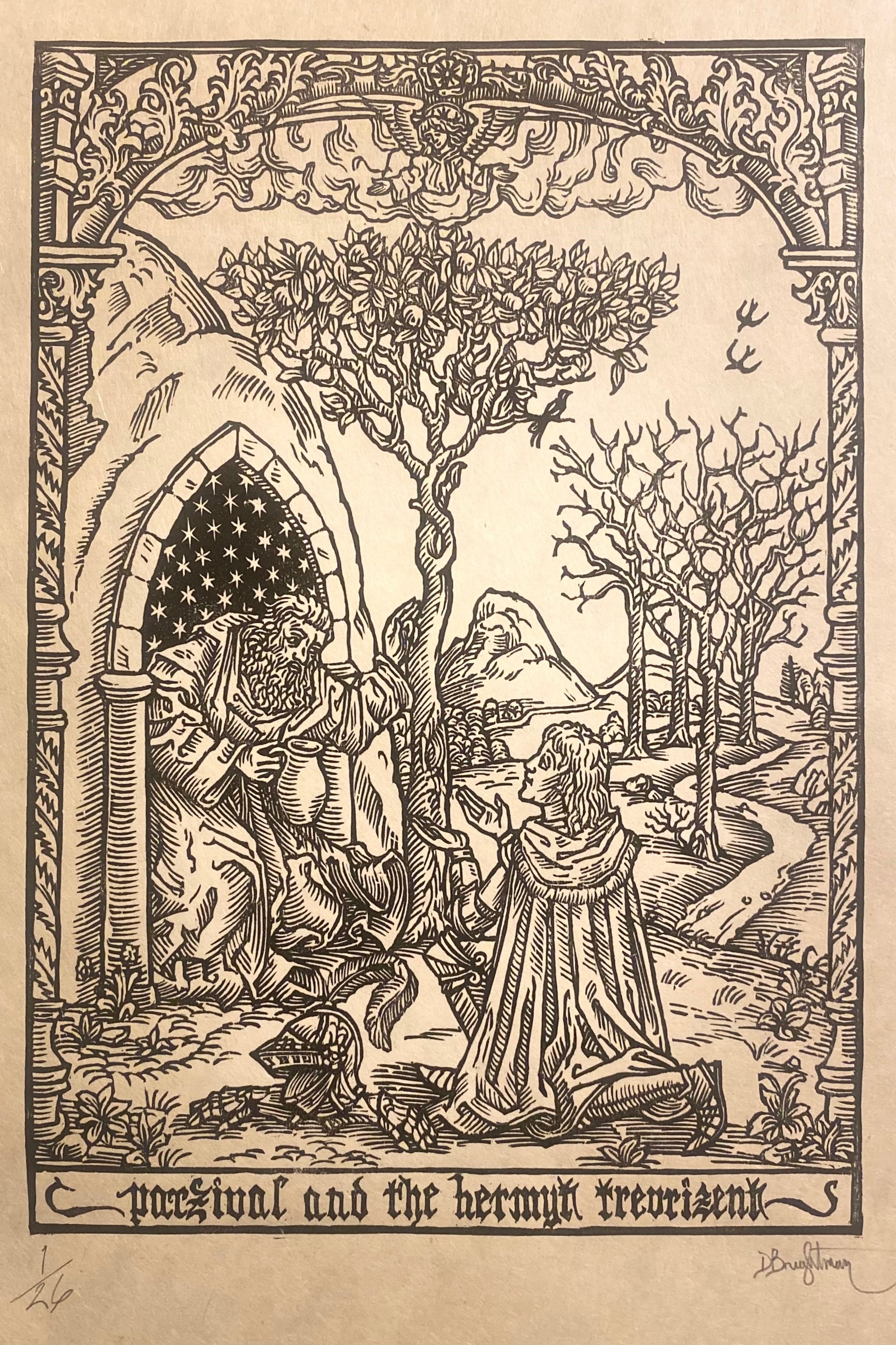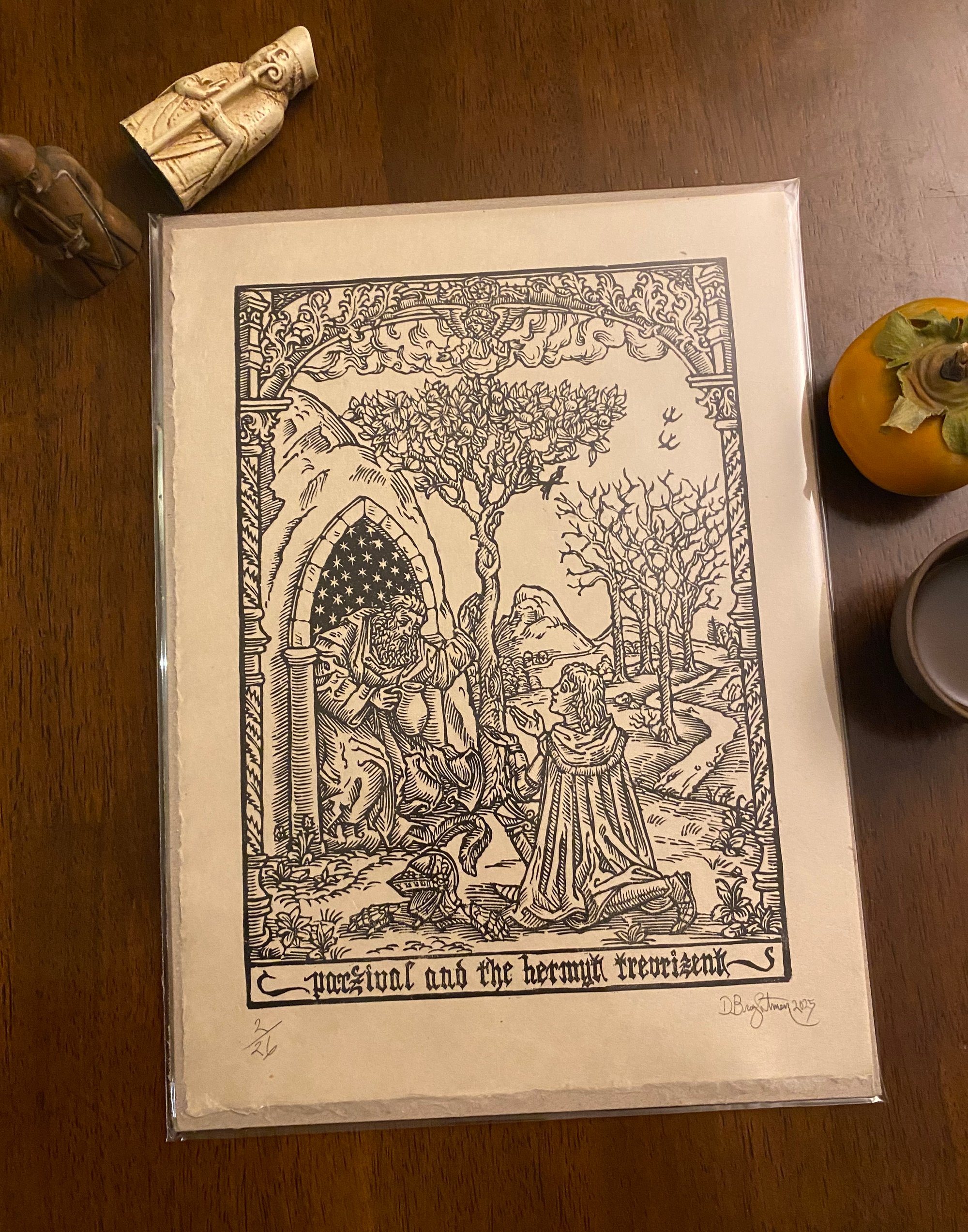 I took a few artistic liberties with this part of the story to further embellish the symbolism of the encounter; Parzival walks away from a long path that has grown barren. The dead trees behind him stand as emblems of pride, doubt, and the desolation of his earlier striving. Before him he meets the hermit, a reoccurring character in every hero’s journey. Trevrizent stands in a doorway to a cave filled with stars–a guardian of the inner cosmos, the interior of the soul where true transformation takes place. Parzival kneels before him, armor removed, palms orans with humility. The end of the Nigredo and the beginning of the Albedo.