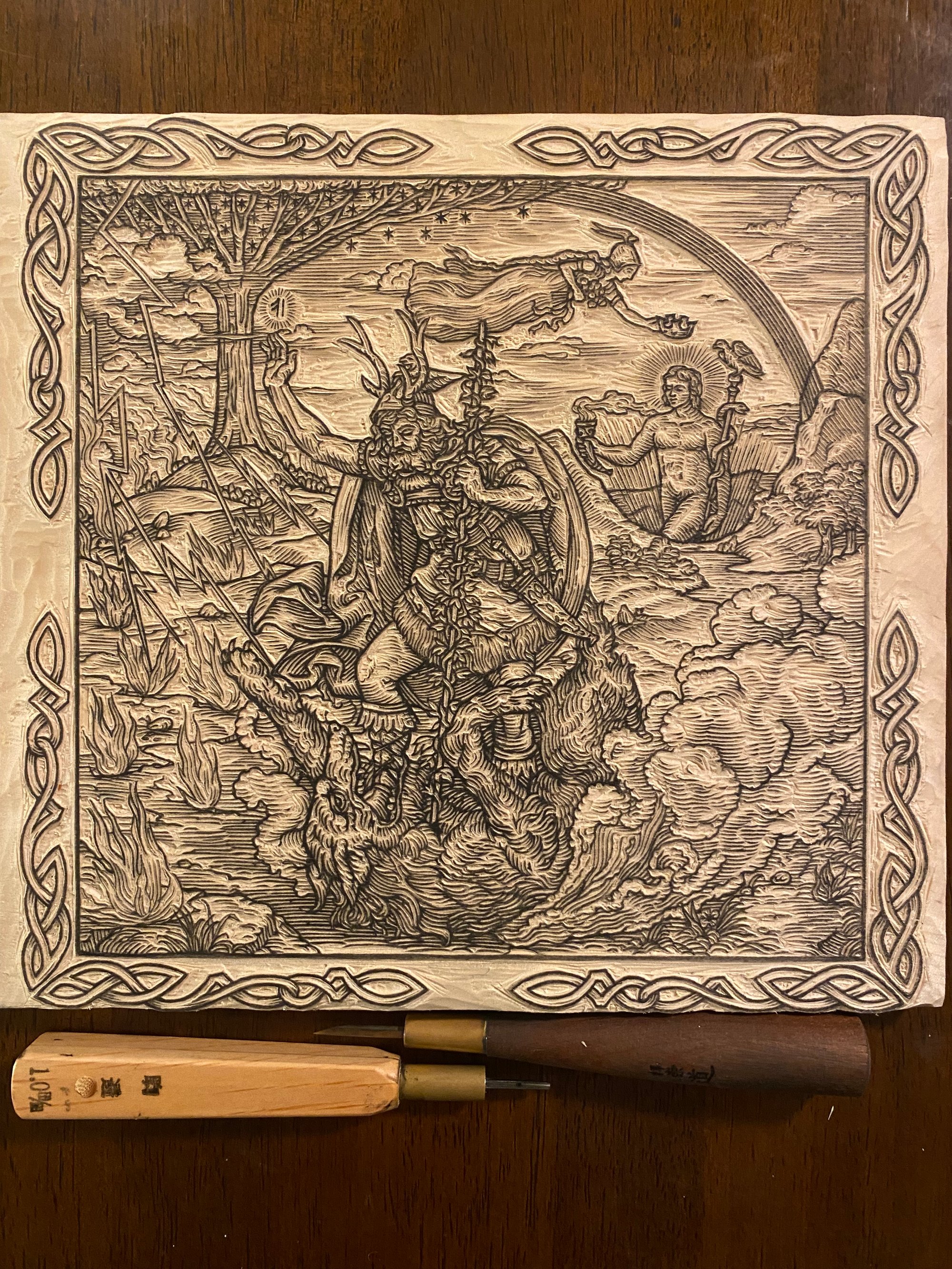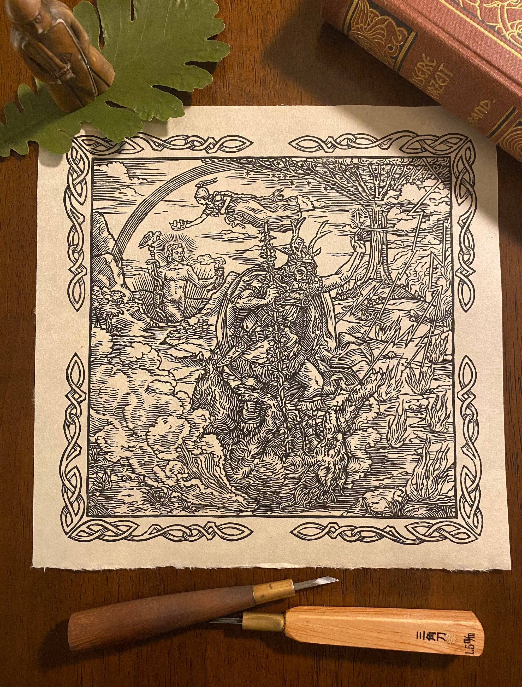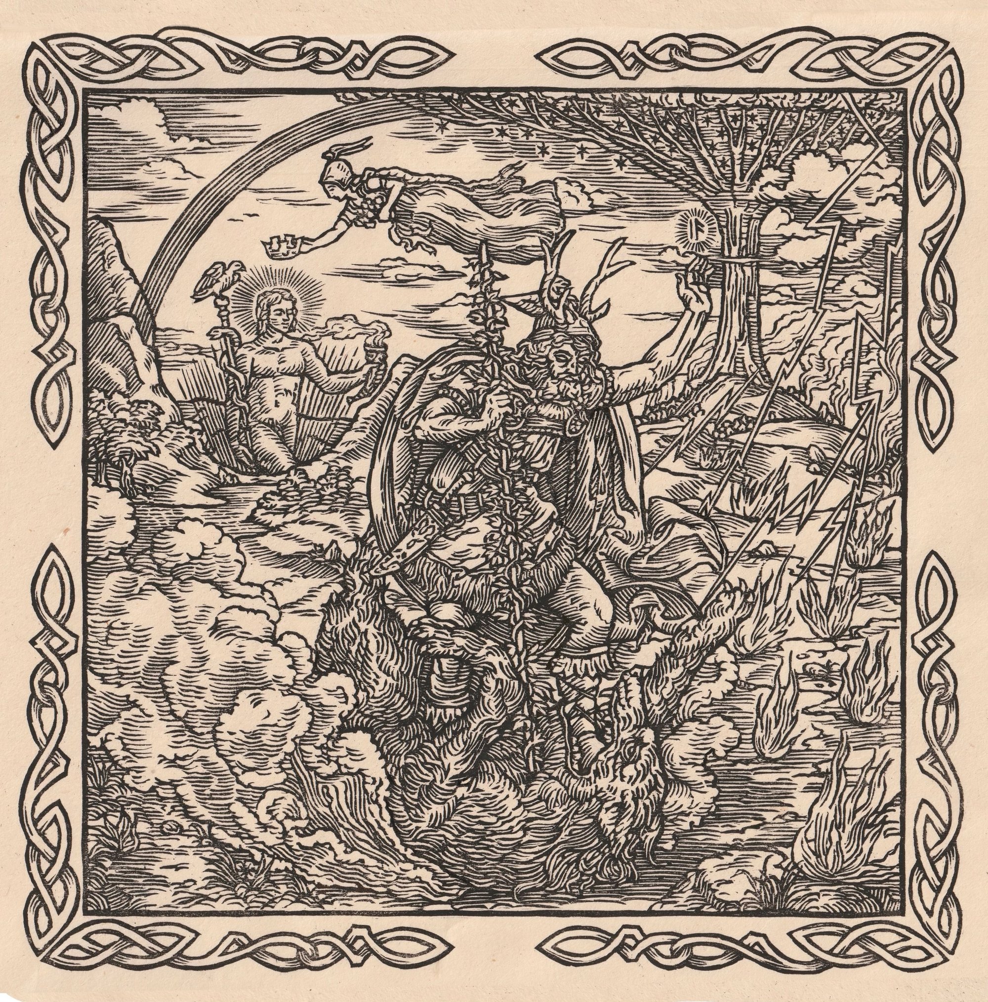 The print depicts Víðarr The Silent God felling Fenrir with his 'mighty boot in his jaws.' Baldr returns from Hel, crowned to reign over the renewed cosmos after Ragnarök.